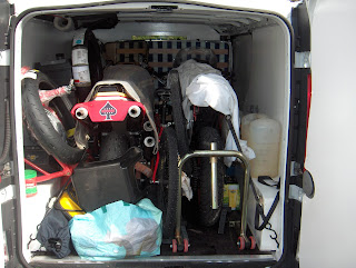 Well, not quite as much space in the van as compared with the trailer and car, so it's a bit of a squeeze, however everything is in (even the bicycle!), so we are leaving this evening and stopping off in Montpellier, and finishing the trip Friday morning.Should reach the circuit at around midday.